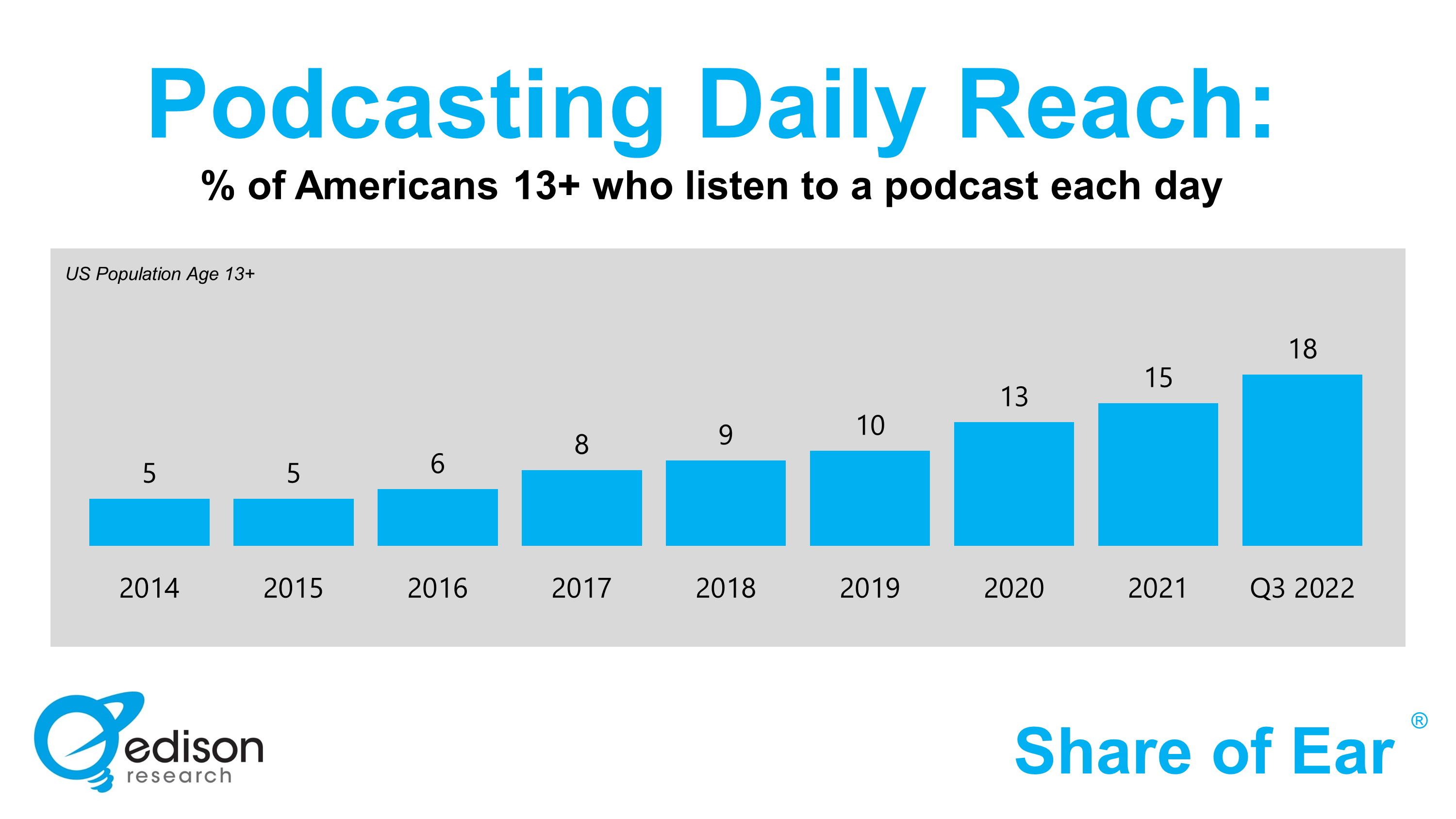 EDISON RESEARCH has issued a graph showing the increase in podcasting's reach over the last eight years, highlighting the latest Share of Ear study with a 20% increase in podcasting's reach among Americans 13 and older (18%) year-over-year as of third quarter 2022. The figure is up from 5% in 2014. Podcasts represent 24% of spoken word audio consumption.