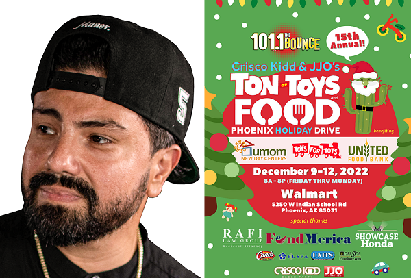 SIERRA H BROADCASTING Rhythmic AC KZCE (101.1 THE BOUNCE)/PHOENIX afternoon host CRISCO KIDD's annual "TON OF TOYS & HOLIDAY FOOD DRIVE" gets underway FRIDAY (12/9), collecting unwrapped toys, toiletries, and non-perishable food for UMON NEW DAY CENTERS, UNITED FOOD BANK, and TOYS FOR TOTS AZ. KIDD will set up at a PHOENIX-area WALMART FRIDAY morning and camp there through MONDAY at 8p.