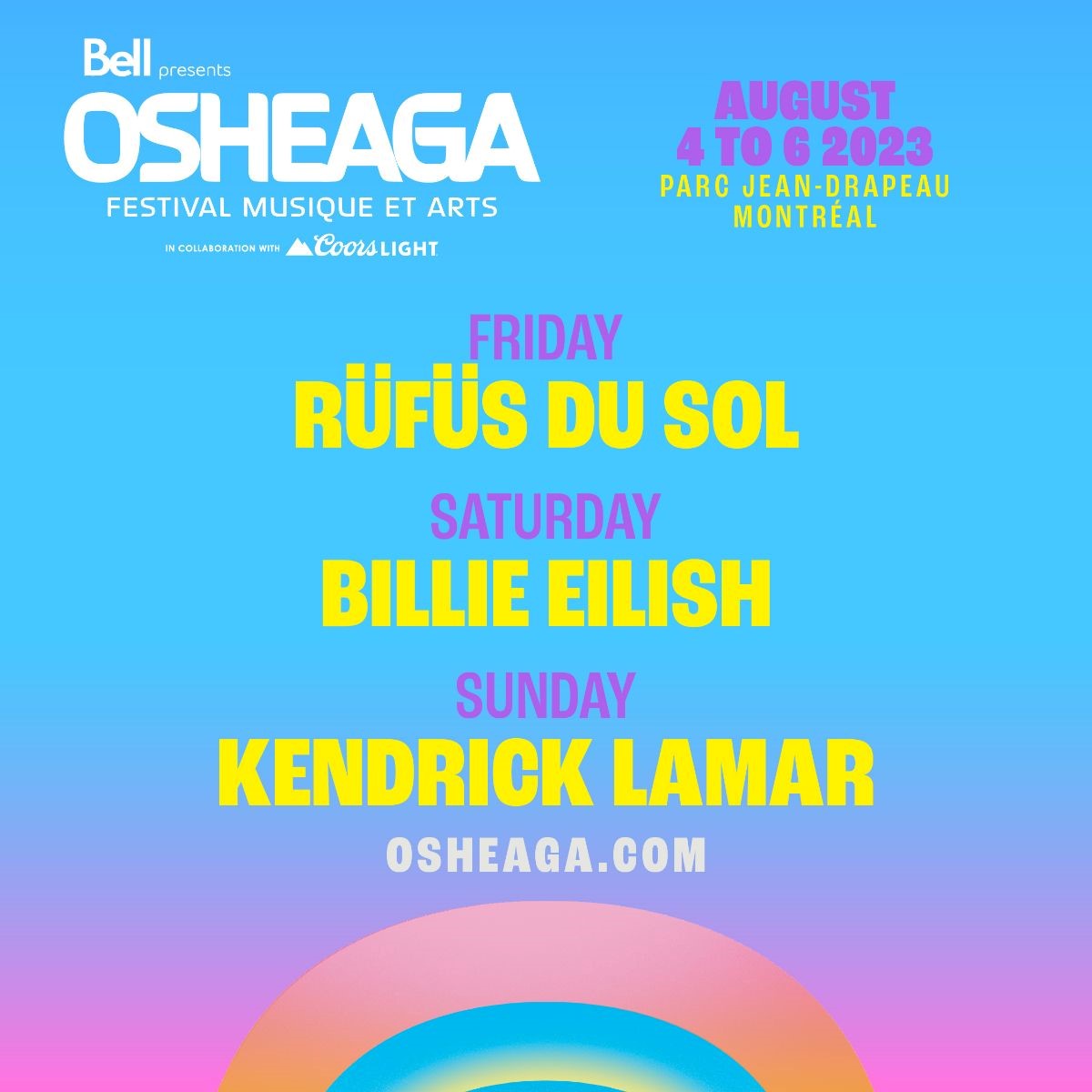BILLIE EILISH, KENDRICK LAMAR And RÜFÜS DU SOL are set to headline OSHEAGA MUSIC AND ARTS FESTIVAL happening AUGUST 4th - 6th, 2023 in MONTREAL’s PARC JEAN-DRAPEAU on ÎLE SAINTE-HÉLÈNE.