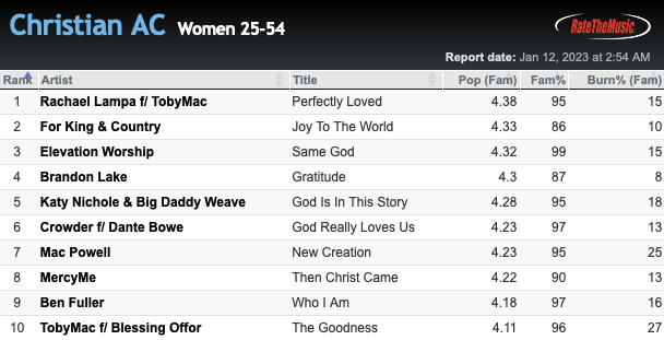 Every THURSDAY morning, Contemporary Christian song test scores are available from ALL ACCESS and MEDIABASE through RATETHEMUSIC.