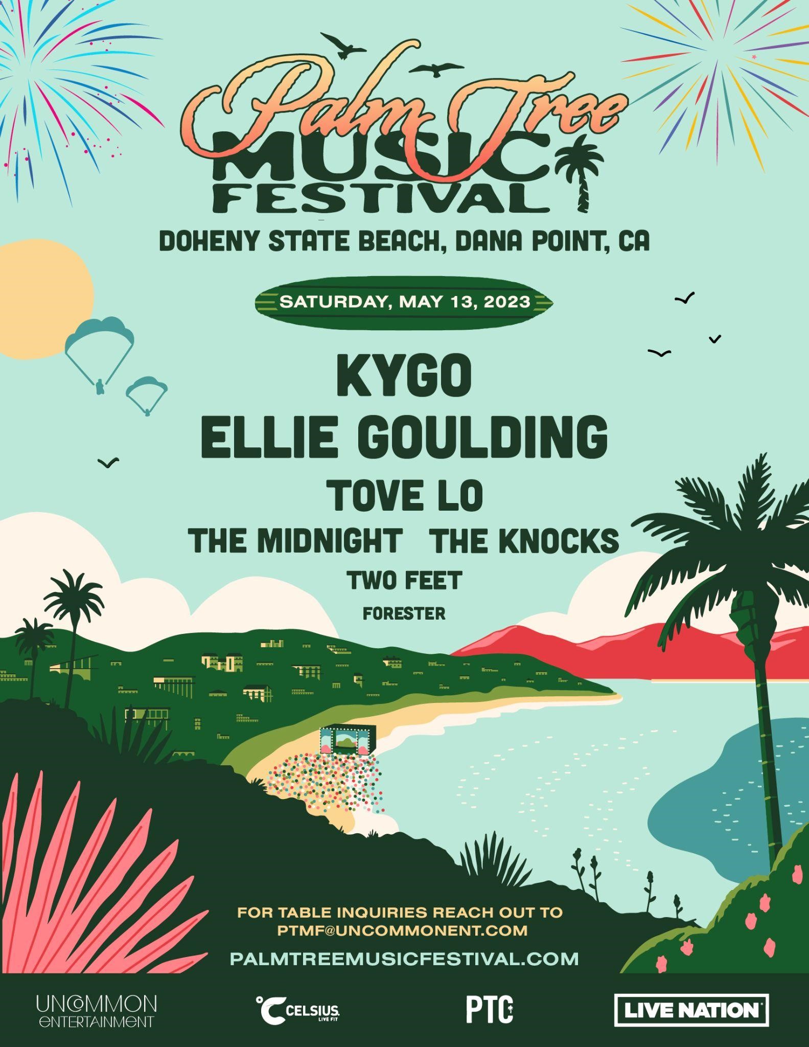 KYGO, ELLIE GOULDING and TOVE LO are set to headline the first PALM TREE MUSIC FESTIVAL taking place SATURDAY, MAY 13th, at DOHENY STATE BEACH in DANA POINT, CA.
