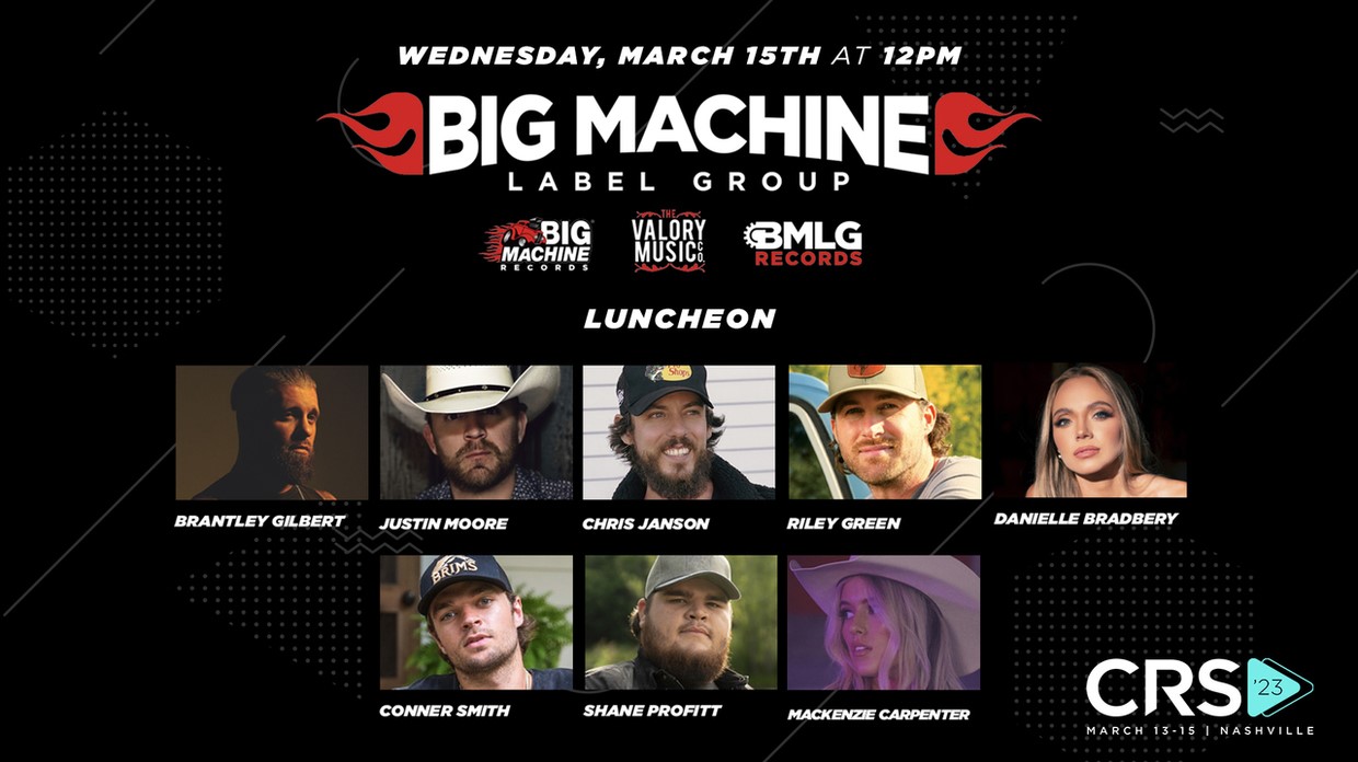 COUNTRY RADIO SEMINAR (CRS) and BIG MACHINE LABEL GROUP have announced the lineup for the 2023 label luncheon on WEDNESDAY, MARCH 15th in the BROADWAY BALLROOM (CRS PERFORMANCE HALL) at the OMNI NASHVILLE hotel, beginning at noon (CT). BRANTLEY GILBERT is set to headline, and JUSTIN MOORE, CHRIS JANSON, RILEY GREEN, DANIELLE BRADBERY, CONNER SMITH, SHANE PROFITT and MACKENZIE CARPENTER will also perform during the event.