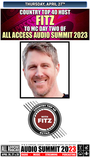 Longtime Country on-air personality and syndicated “COUNTRY TOP 40” host FITZ has been corralled, lassoed and branded as our MC for day two, APRIL 27th of ALL ACCESS AUDIO SUMMIT 2023 which airs for three days, APRIL 26, 27, 28 across the NUVOODOO CONFERENCE CLOUD.