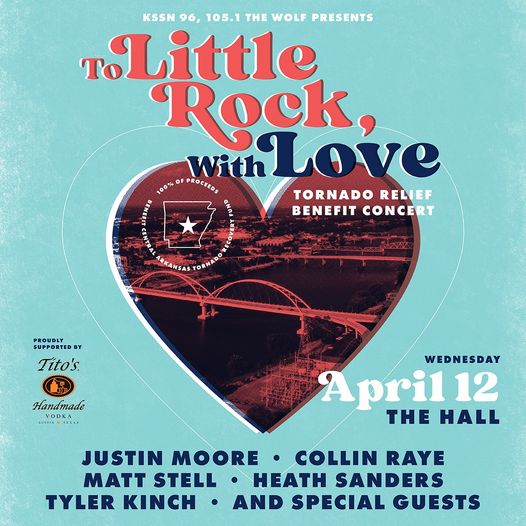 iHEARTMEDIA Country KSSN/LITTLE ROCK, AR will host a benefit concert for tornado relief, LITTLE ROCK, WITH LOVE on WEDNESDAY, APRIL 12th at THE HALL. ARKANSAS-based Country artists JUSTIN MOORE, COLLIN RAYE, MATT STELL, HEATH SANDERS, TYLER KINCH and other special guests are set to perform. All proceeds from the event will benefit the CENTRAL ARKANSAS TORNADO RECOVERY FUND.