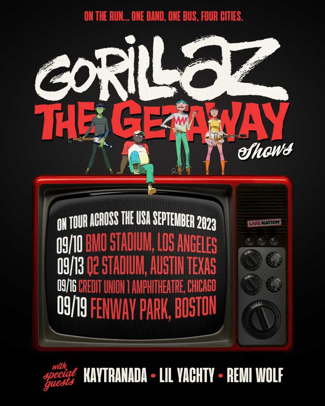 GORILLAZ has announced a series of four U.S. shows called, "THE GETAWAY" slated for this FALL with support from KAYTRANADA, LIL YACHTY and REMI WOLF. THE GETAWAY will be the final run of U.S. dates in support of the band’s recently released Cracker Island album.