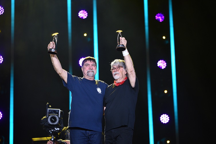Alabama's Teddy Gentry (l) and Randy Owen (r) receiving the CMA Pinnacle Award. (Photo: Nick Zimmer/CMA)