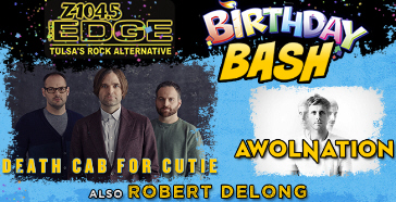 STEPHENS MEDIA GROUP Alternative KMYZ (Z-104.5, THE EDGE)/TULSA announced its 20th "EDGE BIRTHDAY BASH" will be FRIDAY, APRIL 24th featuring DEATH CAB FOR CUTIE, AWOLNATION and ROBERT DELONG at the BRADY THEATER.