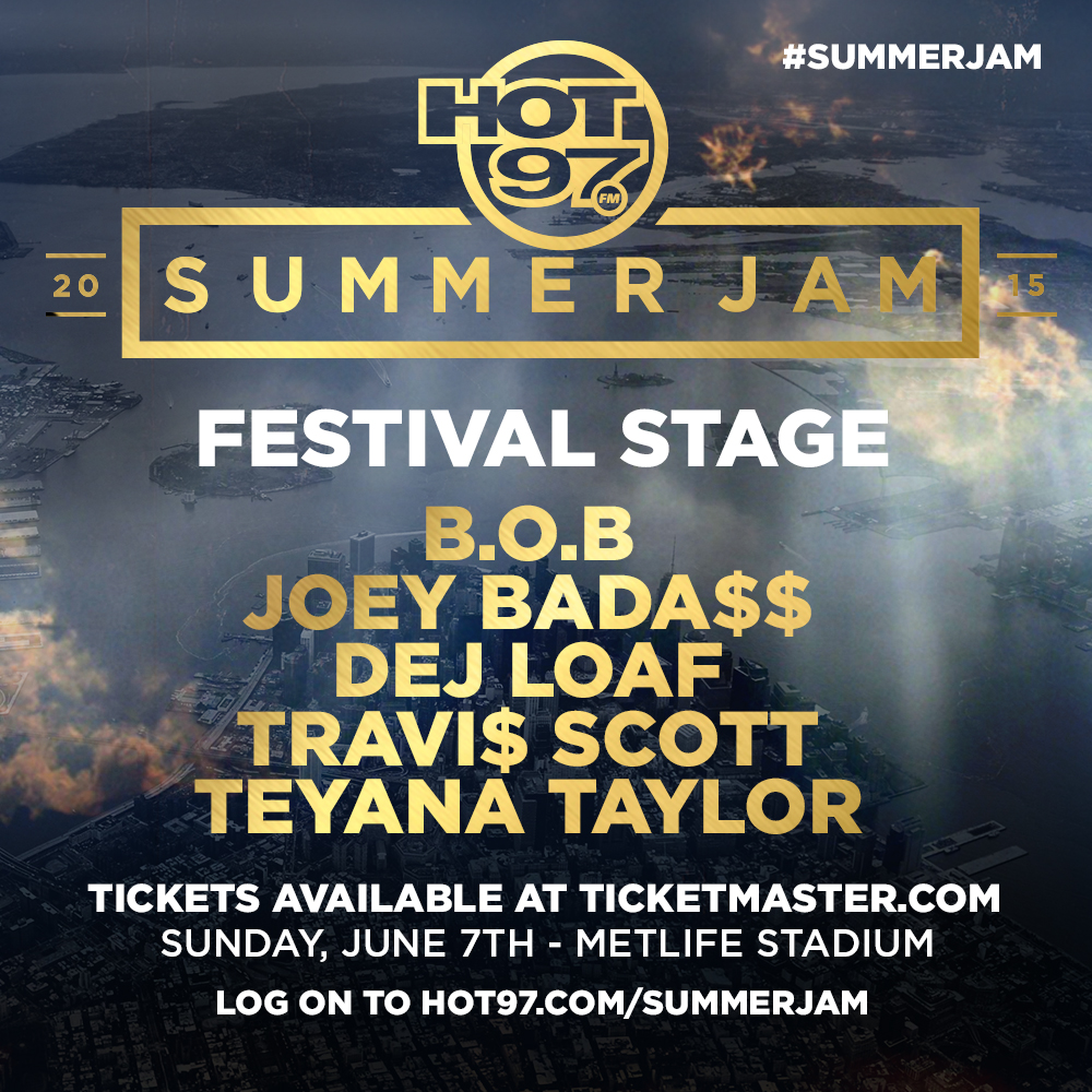 EMMIS Top 40/Rhythmic WQHT (HOT 97)/NEW YORK's HOT 97 SUMMER JAM is locked in for SUNDAY, JUNE 7 at METLIFE STADIUM. This morning (3/19), HOT 97 morning host EBRO announced details on this year's HOT 97 SUMMER JAM Festival Stage. The Festival Stage outside of METLIFE STADIUM will feature performances by B.o.B, JOEY BADA$$, DEJ LOAF, TRAVI$ SCOTT, and TEYANA TAYLOR. The Festival Stage is the beginning, with the Stadium Stage lineup to be announced next week.