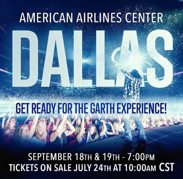 GARTH BROOKS will take his "WORLD TOUR" to DALLAS on FRIDAY, SEPTEMBER 18th and SATURDAY, SEPTEMBER 19th for two scheduled shows at AMERICAN AIRLINES CENTER. Tickets for the two 7p (CT) events go on sale next FRIDAY, JULY 24th via TICKETMASTER; look for more shows to be added to meet demand, as has been BROOKS' policy in previous cities on the "WORLD TOUR" with wife TRISHA YEARWOOD.