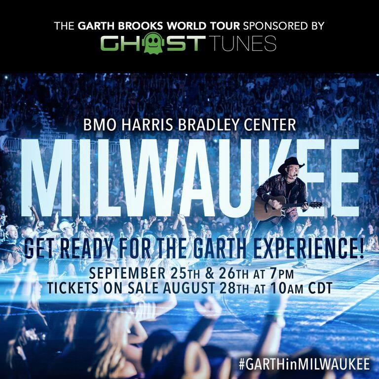 GARTH BROOKS is taking his "WORLD TOUR" to the BMO HARRIS BRADLEY CENTER in MILWAUKEE for shows on FRIDAY, SEPTEMBER 25th and SATURDAY, SEPTEMBER 26th.
