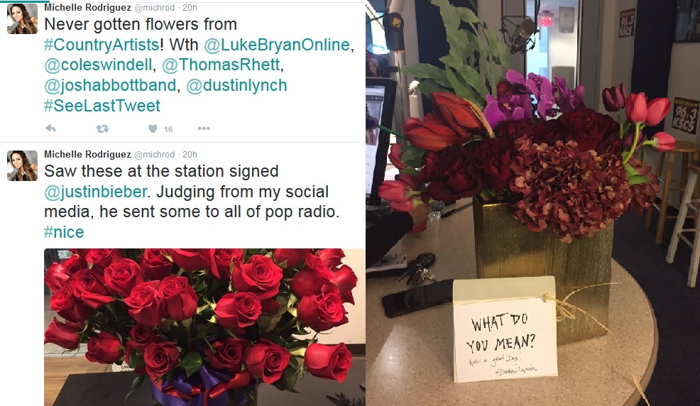 RODRIGUEZ shared a photo of a beautiful rose bouquet sent to Pop radio from JUSTIN BIEBER and said, "Never gotten flowers from #CountryArtists! WTH, LUKE BRYAN, COLE SWINDELL, THOMAS RHETT, JOSH ABBOTT BAND, [and] DUSTIN LYNCH." All in good fun, BROKEN BOW artist DUSTIN LYNCH responded with a beautiful bouquet of his own, sent directly to RODRIGUEZ. The card simply said, "What Do You Mean? Have a great day! DUSTIN LYNCH." "What Do You Mean?" is the title of the newest BIEBER song being promoted; the play on words and kind gesture was not lost on RODRIGUEZ, who posted a video thanking LYNCH.