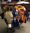 This year, with DENVER's victory over the PATS sending them to next weekend's SUPER BOWL, KELLY finally had enough, placing one live "bronco" donkey in GOODMAN's office decked out in DENVER gear. To further add to the practical joke, the donkey relieved himself right on the floor of GOODMAN's office. Check out the video below for what happened: