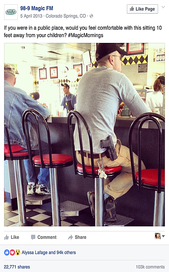 CUMULUS MEDIA Top 40 KKMG (98.9 MAGIC FM)/COLORADO SPRINGS posted the picture of an open-carry diner and asked listeners if they would feel comfortable “with this sitting 10 feet away from your children.”