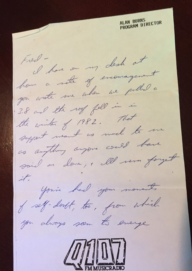 "And I came across this note from ALAN BURNS. We were each programming ABC-owned radio stations back then; him at Q107 in D.C., and me here at WRIF in DETROIT. I was experiencing one of those ratings valleys, and began to question everything."