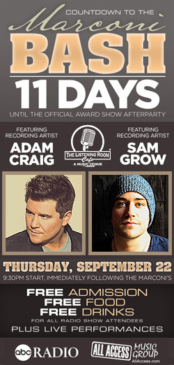 The fun continues at the ABC RADIO/ALLACCESS.com POST-MARCONI BASH, the official MARCONI RADIO AWARDS SHOW afterparty. THURSDAY, SEPTEMBER 22nd at THE LISTENING ROOM, the party will feature STONEY CREEK recording artist ADAM CRAIG -- and we've added a second act, recording artist SAM GROW!