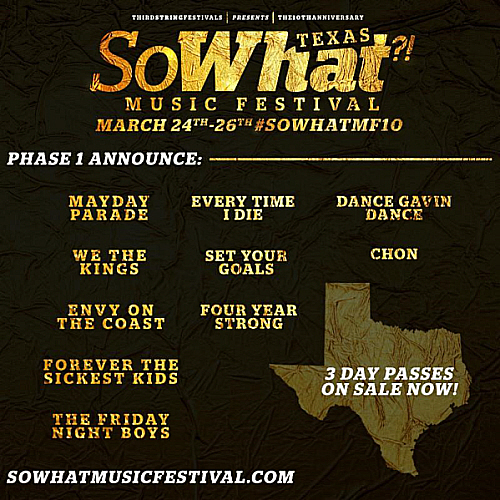 The 10th Anniversary celebration of SO WHAT?! MUSIC FESTIVAL, taking place MARCH 24th-26th, actually starts FRIDAY, MARCH 24th at multiple venues in DEEP ELLUM, TX. There will be numerous 10-year album celebrations as well as the best current popular bands in the scene! The DEEP ELLUM shows will feature intimate "secret shows" from some of the festivals headliners as well plenty of other bands.