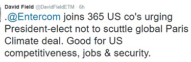 His TWITTER post read: "@Entercom joins 365 US co's urging President-elect not to scuttle global Paris Climate deal. Good for US competitiveness, jobs & security."