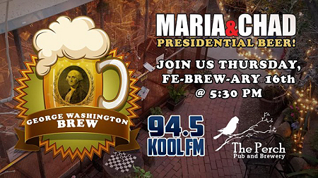 CHAD MITCHELL of the KOOL Morning Show, Maria & Chad, dug up the recipe for GEORGE WASHINGTON’s beer. The PERCH BREWERY modified the recipe to create MARIA & CHAD’s Presidential Beer Porter.