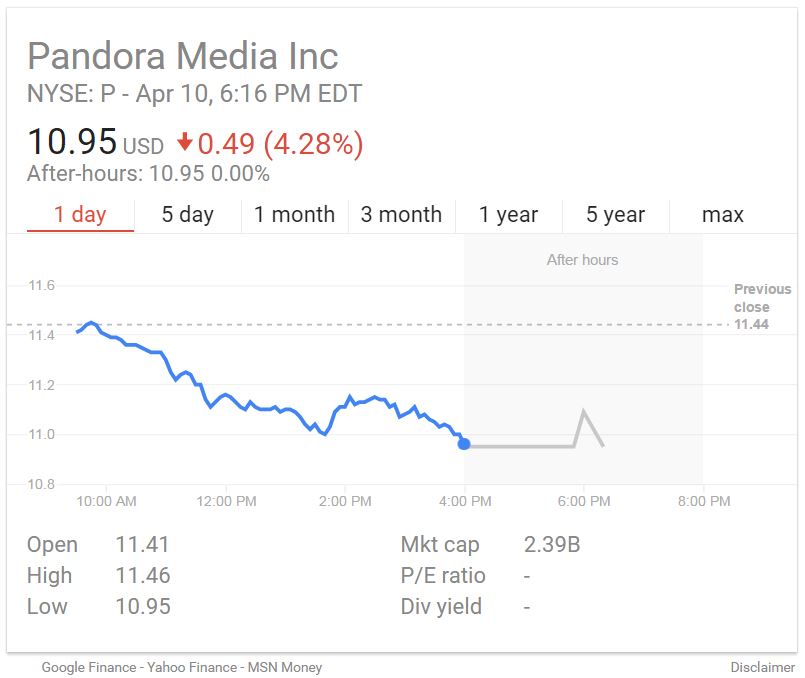 PANDORA shares closed down 4.28% to $10.95. That's down from an OCTOBER high of $14.77.