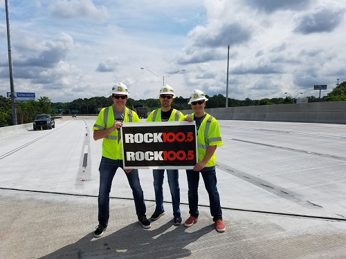 BAILEY, SOUTHSIDE STEVE and DIGI-DUDE NATE loaded into their ROCK 100.5 station van SATURDAY morning and drove to the mouth of the interstate shutdown. After the orange barricades were moved aside, the morning crew was off driving down a newly paved interstate without another soul on the road. They were able to park their station van across the new bridge, and take some entertaining photos and videos for their listeners to get a sneak peek of the new interstate before it’s opening. The show’s producer DIGI-DUDE NATE said, “It’s not everyday you can lay down in the middle of one of the busiest roads in the country.”