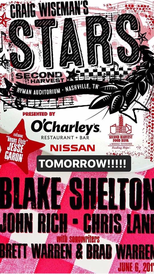 WARNER MUSIC NASHVILLE artist BLAKE SHELTON will headline the 13th annual "STARS FOR SECOND HARVEST" benefit concert TOMORROW (6/6) at the RYMAN AUDITORIUM in NASHVILLE. Hosted by BIG LOUD RECORDS/BIG LOUD SHIRT founder/songwriter CRAIG WISEMAN, the concert will feature a songwriter's round with WISEMAN and the WARREN BROTHERS, followed by acoustic sets from BIG LOUD RECORDS artist CHRIS LANE and SHELTON.