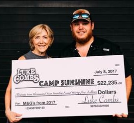 RIVER HOUSE/COLUMBIA NASHVILLE's LUKE COMBS made a donation to CAMP SUNSHINE, a GEORGIA-based retreat for children with life-threatening illnesses, utilizing proceeds from his recently-launched VIP meet and greet program. COMBS presented a donation check in the amount of $22,235 to CAMP SUNSHINE Exec. Dir. SALLY HALE during a performance in ATLANTA this past SATURDAY (7/8).