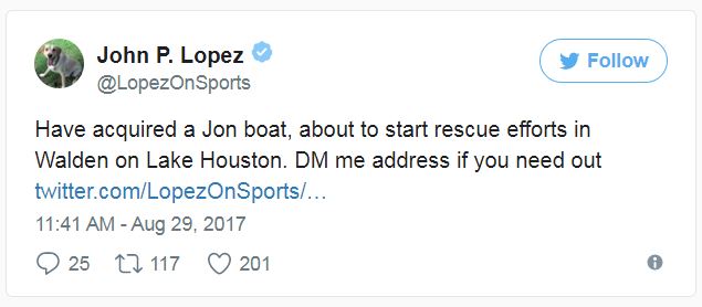 CBS RADIO Sports KILT-A (SPORTS RADIO 610)/HOUSTON middayer JOHN LOPEZ went above and beyond earlier this week during the flooding in his city from HURRICANE HARVEY. USA TODAY reports LOPEZ, "pulled into a middle-aged couple’s front yard on a 16-foot fishing boat TUESDAY afternoon. Although they had never met, the HOUSTON-area couple was thrilled to see him. He tossed them two life vests and helped them onto the boat. He never said his name, nor did they say theirs. There was no need for introductions. The couple was safe, and LOPEZ was again on his way to find more survivors in the wake of the overwhelming devastation left by HURRICANE HARVEY."