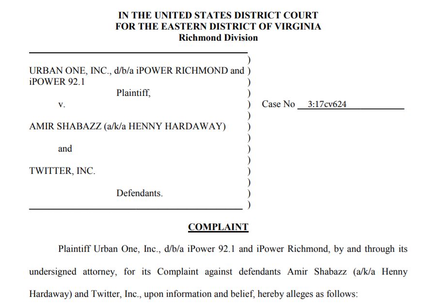 URBAN ONE is suing a former employee -- accusing AMIR SHABAZZ of hijacking the TWITTER account of Urban WCDX (iPOWER 92.1-104.1)/RICHMOND,VA. The suit also names TWITTER, blaming the company for not quickly moving to fix the situation.