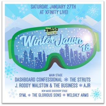 iHEARTMEDIA Alternative WRFF (RADIO 104.5)/PHILADELPHIA presents “WINTER JAWN ‘18” on SATURDAY, JANUARY 27, 2018 at XFINITY Live! featuring live performances by DASHBOARD CONFESSIONAL, THE STRUTS, J. RODDY WALSTON & THE BUSINESS, AJR, and a PHILLY local band to be announced. Plus, there will be a NEW MUSIC DISCOVERY STAGE featuring SYML, THE GLORIOUS SONS, and WELSHLY ARMS.
