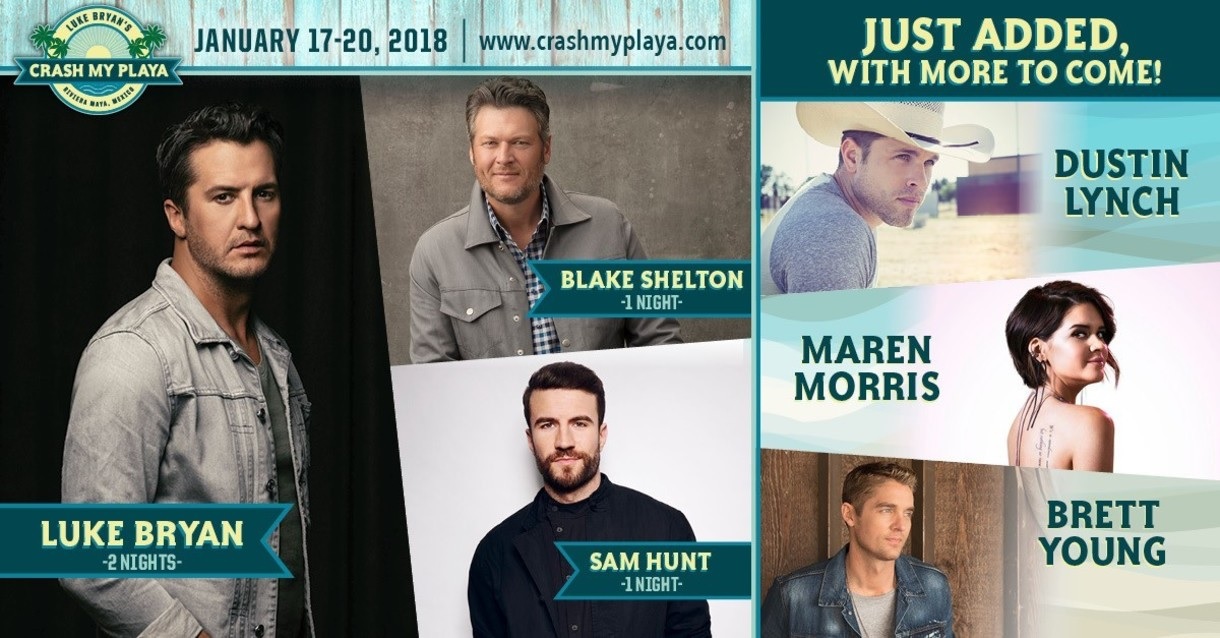 DUSTIN LYNCH, MAREN MORRIS, and BRETT YOUNG have signed on to join headliners LUKE BRYAN, BLAKE SHELTON, and SAM HUNT for BRYAN's "CRASH MY PLAYA" all-inclusive concert vacation (NET NEWS 9/7). Running from WEDNESDAY, JANUARY 17th through SATURDAY, JANUARY 20th, 2018, BRYAN and friends will once again descend on RIVIERA MAYA, MEXICO (NET NEWS 5/19).