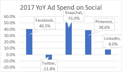 With the only exception of TWITTER (-11.8%), all the major social network sites delivered growth in 2017. FACEBOOK (including INSTAGRAM) posted +40.5% growth in U.S. ad revenue within the SMI Pool of agencies, with SNAPCHAT closing the year at +51% growth after tremendous growth in the first two quarters of the year and a marked deceleration in Q3 and Q4.