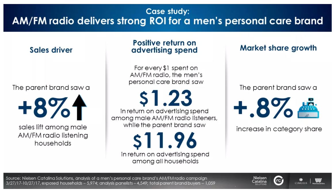 "Using this information, NIELSEN can give a clear picture of sales impact driven by the AM/FM radio campaign and those who were not. The men’s personal care brand AM/FM radio campaign ran from MARCH 2017 through SEPTEMBER 2017. Here’s what NIELSEN CATALINA SOLUTIONS found: