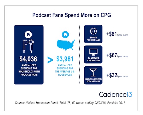 Among the findings, podcast fans are shown to spend slightly more per household per year on consumer packaged goods ($4,036, as opposed to $3,981 for the average household, with sports podcast fans spending the most); podcast fans are 58% of all women's beauty buyers, 56% of all snack buyers, and 53% of all carbonated beverage buyers; and the podcast audience influences over $12.9 billion in annual snack purchases, outspending the average household by 4.5%.