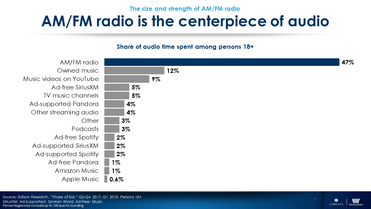 WESTWOOD ONE has taken a dive into EDISON RESEARCH's Share of Ear report for first quarter 2018, and in a blog post by Dir. of Content Marketing LAUREN VETRANO at the WWO website, the syndicator is pointing to radio's continued dominance of audio listening as a key takeaway from the quarterly report.
