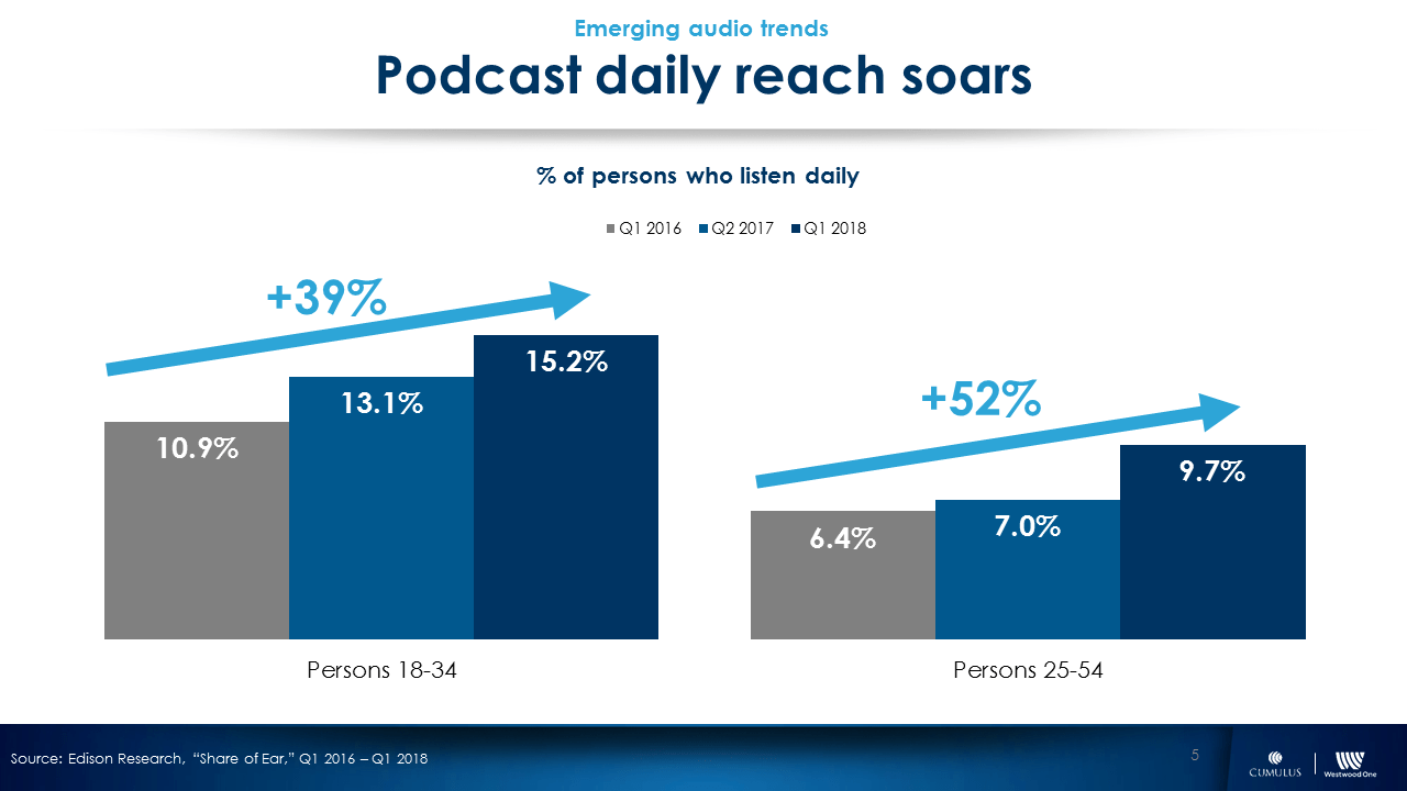 However, podcasting's daily reach is growing, especially among younger audiences, with listening share up 39% in two years to 15.2% among those 18-34 and up 52% to 9.7% in the same period among those 25-54.