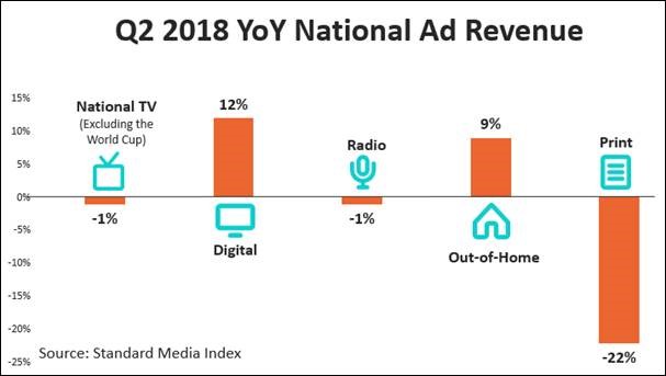 STANDARD MEDIA INDEX unveiled national advertising revenue figures for the second quarter of the year (APRIL – JUNE). The National Advertising market gained 5% in Q2, despite a modest decline in National TV when factoring out the World Cup.