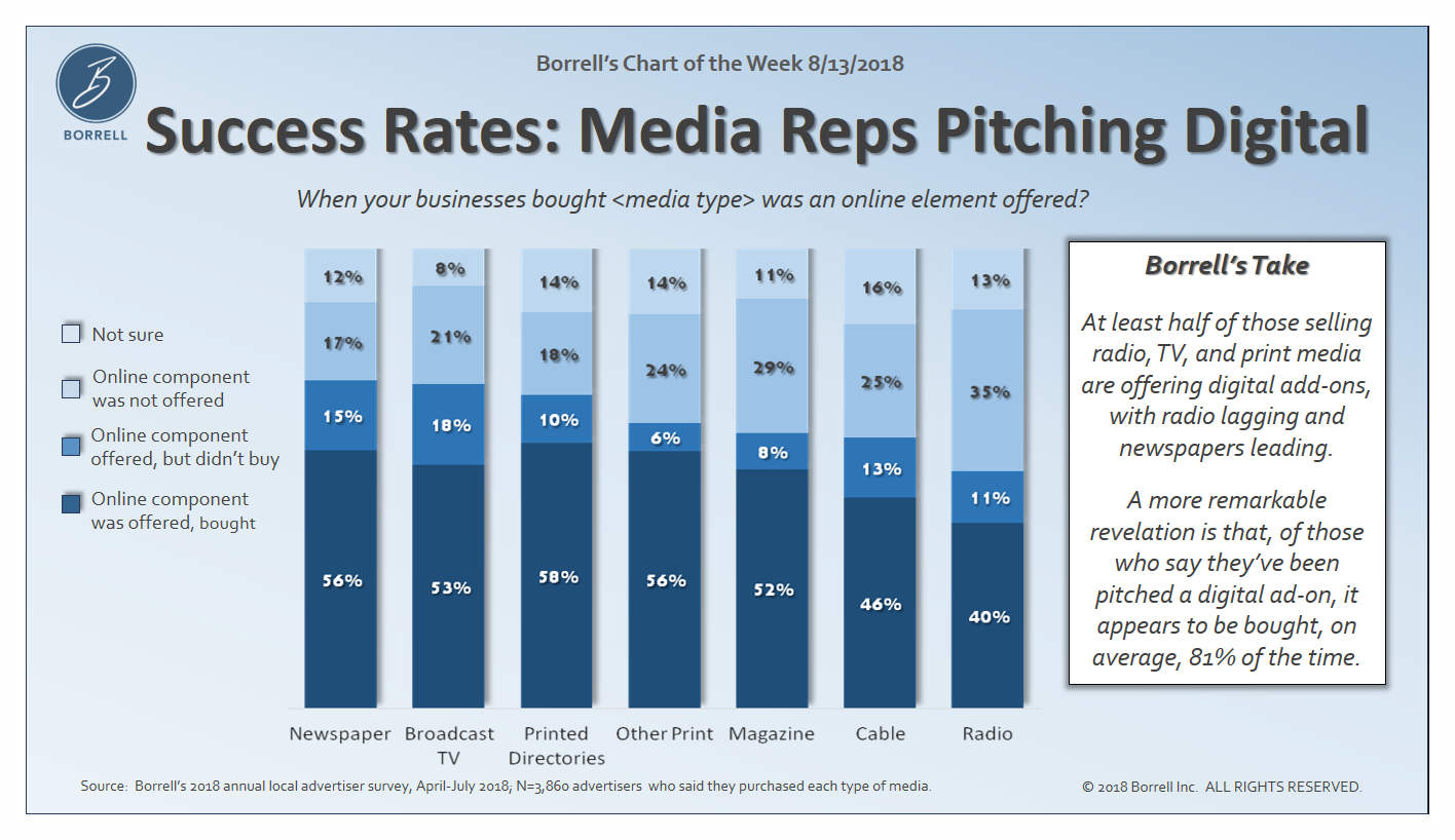 This week's chart notes at least half of those selling radio, TV and print are offering digital add-ons, with radio lagging and newspapers leading.