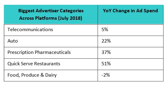 The Prescription Pharmaceutical industry spent the most on advertising this month, growing 26% YoY. Rounding out the top five were: Auto (5%), Food, Produce & Dairy (-10%), Insurance (12%), and Quick Serve Restaurants (19%).