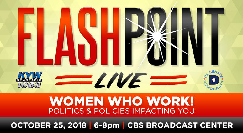 "FLASHPOINT LIVE: WOMEN WHO WORK!," co-produced with the PENNSYLVANIA SENATE DEMOCRATIC CAUCUS, will include two half-hour panels, "Politics of Women who Work" with Sen. TINA TARTAGLIONE, SHE CAN WIN founder JASMINE SESSOMS, and PENNSYLVANIA CENTER FOR WOMEN AND POLITICS Executive Director Dr. DANA BROWN, and "Policies Impacting Women Who Work" with PHILADELPHIA City Councilwoman BLONDELL REYNOLDS BROWN, PHILADELPHIA COMMISSION ON HUMAN RELATIONS and FAIR HOUSING COMMISSION Exec. Dir. RUE LANDAU, WOMEN'S LAW PROJECT Attorney AMAL BASS. KYW Community Affairs Reporter CHERRI GREGG will serve as moderator.