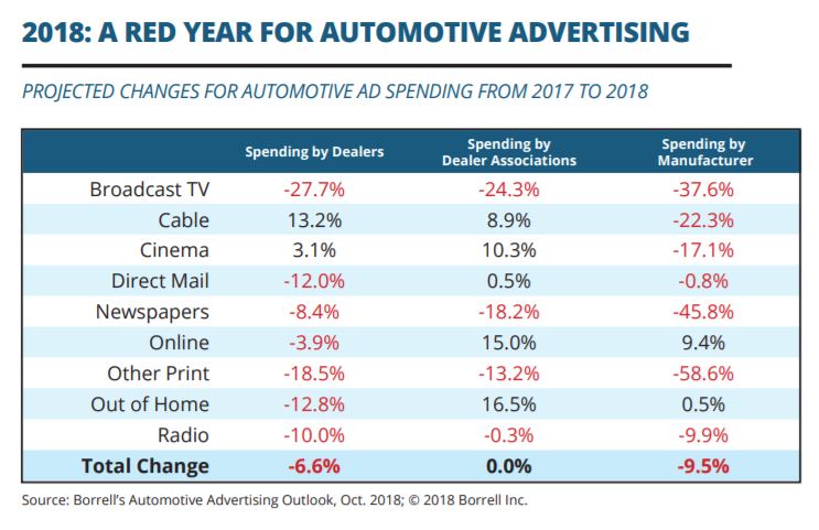 With radio advertising looking to drop, total automotive ad spending this year is down 7.3%, to $34.4 billion. For 2019, BORRELL is forecasting a 3.4% bounce-back, but 2019 seems a long way off, especially for companies that still have their 2018 fourth-quarter numbers to hit. "Our five-year outlook is for low growth, averaging 1.7% per year," writes BORRELL. "Nearly all of it goes to digital advertising. It’s all the result of fundamental changes brought on by the Great Recession a decade ago. That economic trigger forced manufacturers and dealers to rethink marketing expenditures and align them with what potential car buyers were doing and where they could be found. As a result, 67% of all automotive advertising now goes to highly targeted digital media, stealing from traditional print and broadcast channels that are considered less efficient."