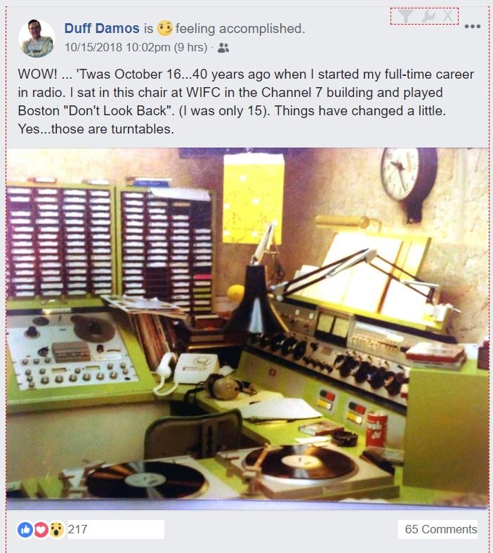 DAMOS writes on FACEBOOK, "WOW!... 'Twas OCTOBER 16... 40 years ago when I started my full-time career in radio. I sat in this chair at WIFC in the Channel 7 building and played BOSTON "Don't Look Back". (I was only 15). Things have changed a little. Yes...those are turntables."