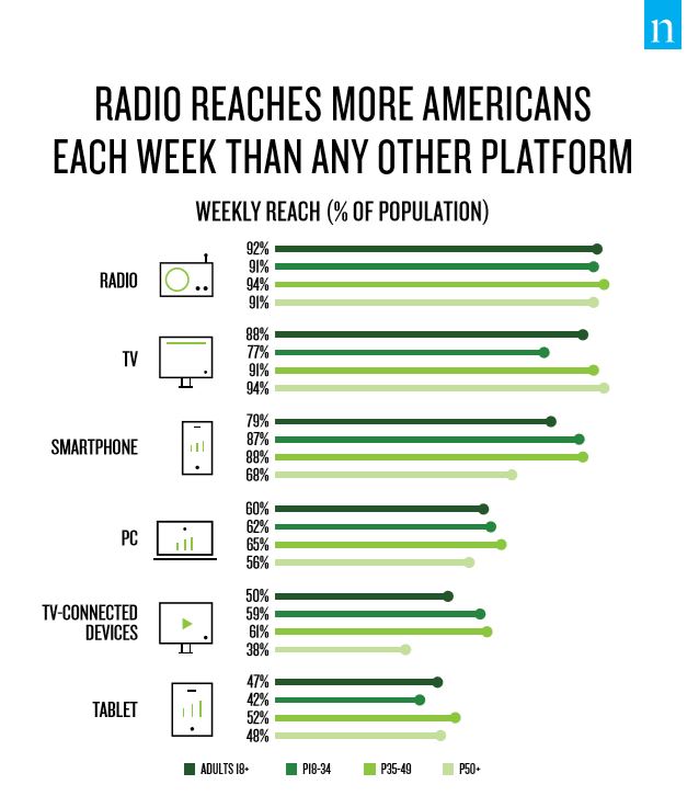 NIELSEN writes, "Consumers in today’s fragmented media landscape have so many ways to discover content that matters to them across devices and platforms. For audio, the golden age is upon us because there simply have never been more ways to listen or more content available than exists today."