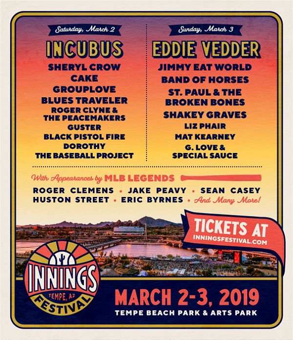 EDDIE VEDDER and INCUBUS will headline the second annual INNINGS FESTIVAL, which will be held MARCH 2nd-3rd at TEMPE BEACH PARK & ARTS PARK in TEMPE, AZ. Also performing will be SHERYL CROW, JIMMY EAT WORLD, CAKE, BAND OF HORSES, GROUPLOVE, ST. PAUL & THE BROKEN BONES, BLUES TRAVELER, SHAKEY GRAVES and more.