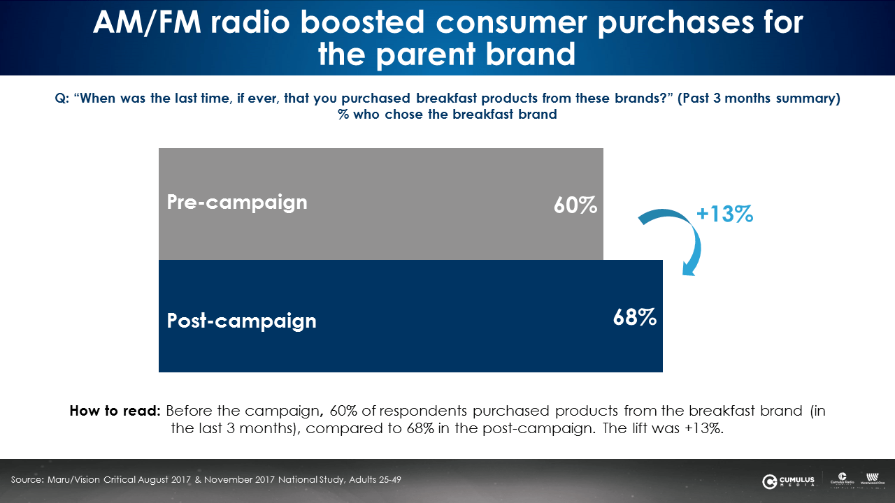 The study, by MARU/VISION CRITICAL and commissioned by WESTWOOD ONE, surveyed 500 respondents before and after the client's AM/FM radio campaign and found that "breakfast thinkers/planners" are likely to be heavy AM/FM radio listeners, 48% more likely than the overall population of adults 25-49. The campaign also increased awareness, purchase behavior, and product trial and brand awareness.