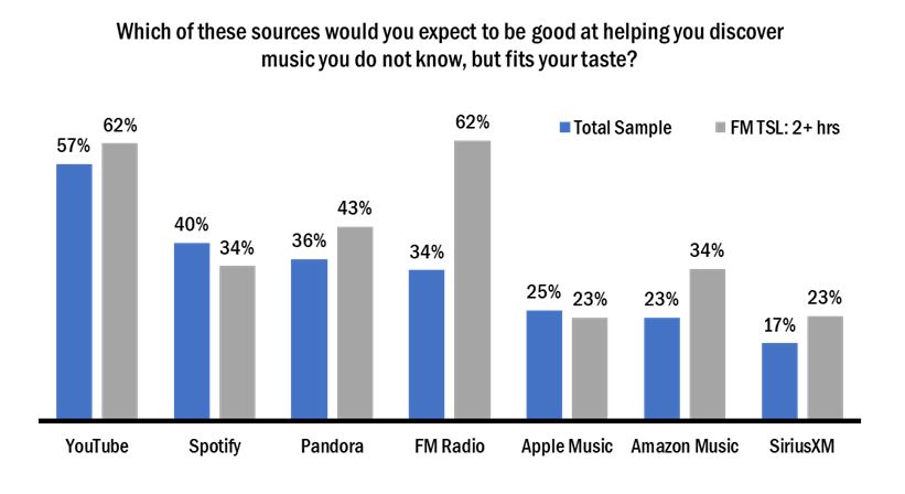 EVP/Research Insights LEIGH JACOBS explained, “When asked, “Which of these sources would you expect to be good at helping you discover music you do not know, but fits your taste?”, the majority answered YOUTUBE. Among likely ratings respondents and those who listen to FM at least two hours a day, FM is no better than tied with YOUTUBE as a music discovery source.”