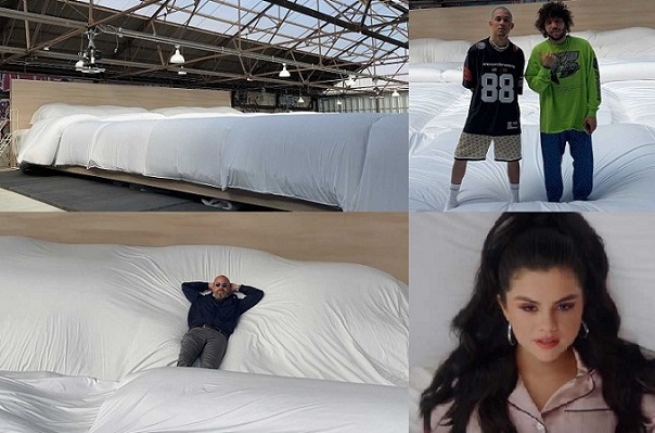 BENNY BLANCO, TAINY, SELENA GOMEZ and J BALVIN recently invited fans to check out the video set for their new song "I Can’t Get Enough," a soundstage that had been converted into a giant bed (just eight feet short of making the Guinness Book Of World Records).