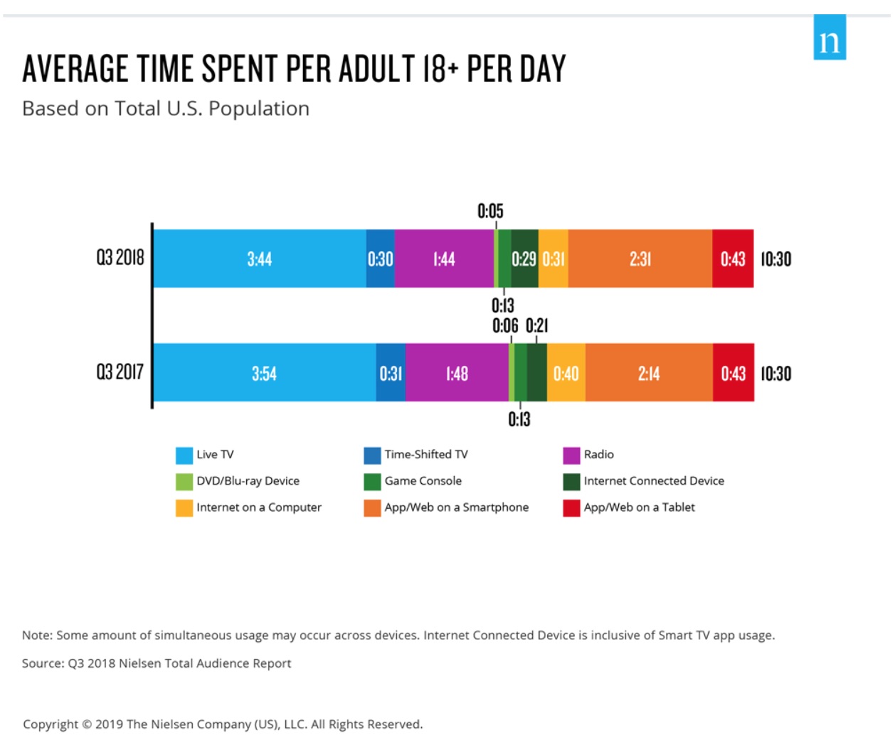 The latest quarterly NIELSEN Total Audience Report offers some insights on streaming audio and video, including how U.S. adults spending 10 hours and 30 minutes per day connected to media, flat from a year ago -- radio's share of that slipped slightly from 1:48 to 1:44 -- with adults 50-64 spending more time per day on media than any other age group.