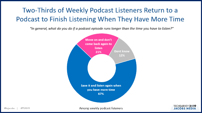 The vast majority of regular podcast listeners say they’ll return to finish an episode at a convenient time.