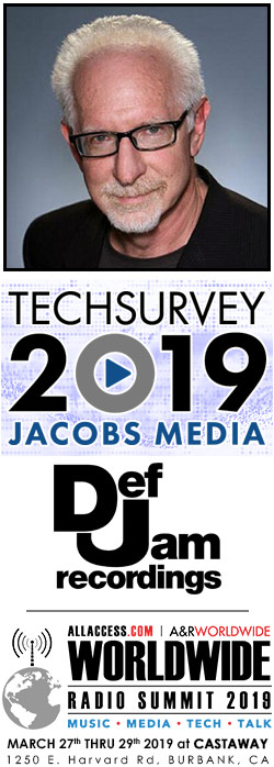 JACOBS MEDIA's TECHSURVEY 2019 will have its debut at the upcoming WORLDWIDE RADIO SUMMIT 2019 at 11a THURSDAY, MARCH 28. It consists of more than 50,000 respondents, representing well more than 500 radio stations across NORTH AMERICA.