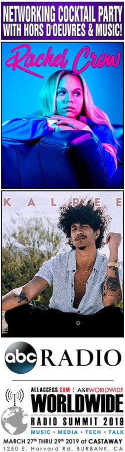 Join ABC RADIO and WORLDWIDE RADIO SUMMIT 2019 one week from TONIGHT for a closing cocktail party you will remember for a long time. Delicious free food, a free-flowing bar with your favorite's to loosen up with -- and the music of S-CURVE recording star RACHEL CROW and EPIC's KALPEE! You will love their music.